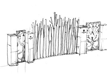 Brána odděluje vesnické prostředí od nevšedního zámeckého světa a zároveň je spojuje. Je ale 21. století, proto je nositelem osvětlení, intercomu, poštovní schránky i automatického otevírání. Hlavní vjezdová část je pojata jako organická součást zahrady v podobě stylizovaného plotu z větví a kmenů mladých stromků, který umožňuje pohled na zámek skrz park. Postranní vstupní branky pro pěší jsou tvořené ozdobnými mřížemi se zlacenými prvky. Kovářská práce je vsazena do pískovcem obložených sloupů, které jsou nositelem praktických nezbytností.