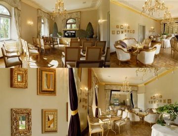 „Pro Zlatý sál v prvním patře jsme hledali něco neobvyklého. Původně jsem si na jeho stěnách představovala velkolepou zlatou tapetu s dekory květin a ptáků. Cena byla ale neúnosná. Pak Oto Bláha (akademický malíř a designér) přišel s nápadem, který mě přímo nadchl. Už první náčrty rozměrných nástěnných maleb dávaly tušit jejich originalitu. A tak se dnes kolem všech stěn Zlatého sálu vine jediný a velkolepý zlatý ornament, který je ve skutečnosti bohatě rozkvetlou zahradou pivoněk, růží a keřů s poletujícími ptáky a motýly.“