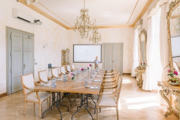 Besprechungsräume Goldener Saal, Bibliothek, Teller-, Tee- oder Theatersaal im Piano Nobile Restaurant sowie der verglaste Patio bieten genug Komfort für kleinere Gruppen, sowie ein passendes Umfeld für Konferenzen für bis zu 70 Personen. Um eine kreative Atmosphäre zu schaffen, ist es möglich, während des Tages die Räume zu wechseln und eine Konferenz in den Schlosssälen mit einem Treffen im englischen Park zu kombinieren. Für größere Gruppen sowie für absolut private Events kann das Schloss exklusiv gemietet werden. Alle Räume sind mit Klimaanlagen ausgestattet.
