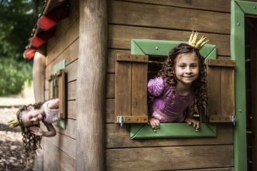 Vom Kinderhäuschen der Prinzessin Julinka führt eine Rutsche direkt zum Kinderspielplatz mit Sandkasten und Schaukeln. Auf dem Sandkasten stehen Sandformen, Schaufeln und Kübel bereit und kleine Baumeister können sich daher ruhig auf den Bau ihres eigenen Traumschlosses einlassen.