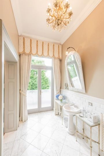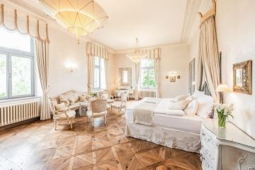 The Legend Suite is the most luxurious room at the chateau. It is decorated in pleasing light pastel tones and guests will be delighted by its beautiful modern bathroom in 19th century style and the balcony with a view of the English park. The suite is suitable not only for newlyweds, but also for those who love luxury combined with beautiful surroundings.