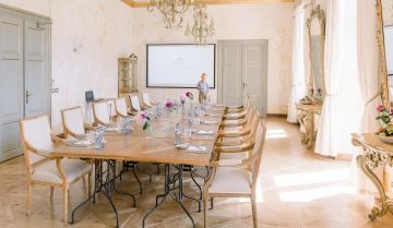 골든 홀, 스튜디올로 도서관, 피아노 노빌레 레스토랑의 시어터 살롱을 포함한 샤토의 미팅 공간은 소수의 참가자들부터 최대 70명까지 편안한 회의를 주최할 수 있습니다. 샤토 홀에서의 미팅은 영국식 정원에서의 특별한 시간과 결합되어 미팅 환경의 다양성과 창의적인 분위기의 조성이 가능합니다. 큰 그룹이나 프라이버시를 위해 샤토를 독점적으로 대여할 수도 있으며, 모든 회의 공간에는 에어컨 시설이 완비되어 있습니다.